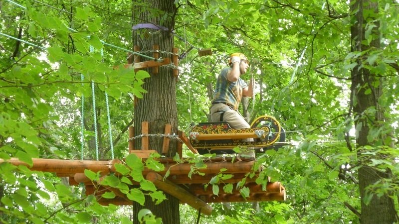 Летом 2013 года аттракцион не действовал, но конструкции так и остались на деревьях. Их наполовину разобрали, а потом почему-то бросили. Тросы и канаты болтались по воздуху, словно змеи. Однажды мне удалось сделать несколько снимков того, как по ним лазают все, кому не лень. Это было очень опасно для людей, и я подумала, что хотя бы такой сигнал заставит чиновников пошевелиться.
