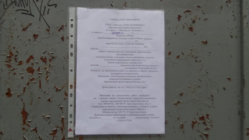 Прошу наказать администрацию ГМЗ «Царицыно» за умышленное сокрытие количества деревьев, предназначенных к вырубке, информации о времени начала и окончания работ, телефона контролирующего ведомства.
