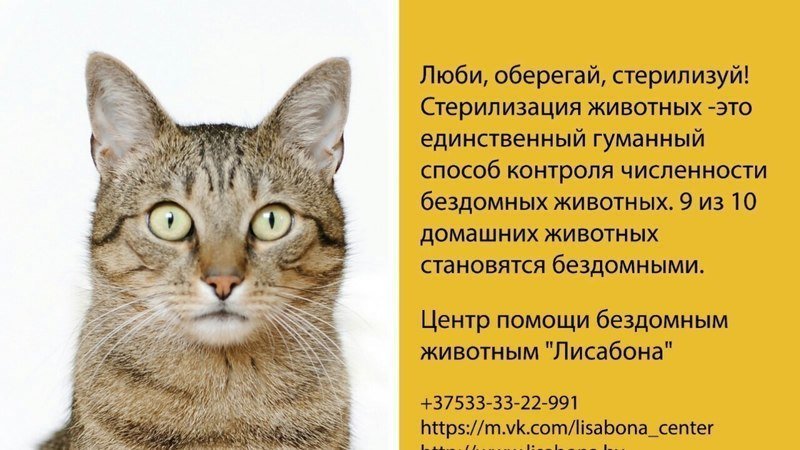 В Кобрине на улицах города появилась первая социальная реклама зоозащитной тематики! В рамках городской программы популяризации гуманного отношения к бездомным животным, а также пропаганды стерилизации животных, Центром помощи бездомным животным "Лисабона", совместно с администрацией города, была разработана и установлена социальная реклама зоозащитной тематики. Данная реклама стала очередным шагом в масштабной программе по решению вопроса бездомных животных гуманными методами, которая действует в городе Кобрине. Данная программа включает в себя льготную стерилизацию домашних и бездомных животных, просветительские занятия в школах, работа с трудовыми коллективами города, распространение социальной рекламы в ветеринарных клиниках города, установку тёплых домиков для зимовки уличных котов и т.д. За реализацию данного проекта хочется поблагодарить мэра города Кобрина ГРИШКЕВИЧА Михаила Михайловича, заместителей председателя райисполкома - Мартынюка Александра Петровича и Трубчика Валентина Васильевича, а также заместителя начальника отдела идеологической работы, культуры и по делам молодёжи Кобринского районного исполнительного комитета Василюк Полину Михайловну. Именно благодаря вашей всесторонней поддержке, все эти проекты стали возможны. Сейчас мы находимся в самом начале нашего пути, но уже за пол года работы Центра, в городе Кобрине была проделана огромная совместная работа, результаты которой видны уже сегодня. Особо хочется отметить, что все вопросы, связанные с монтажом и установкой социальной рекламы, взял на себя город, и выполнил эти работы на безвозмездной основе. Также город освободил Центр от платы за размещение данной рекламы. Приглашаем волонтёров из других городов разместить подобную рекламу в своём городе. Вместе, мы сможем больше!https://vk.com/topic-122778646_34405004?w=wall-146355664_10335