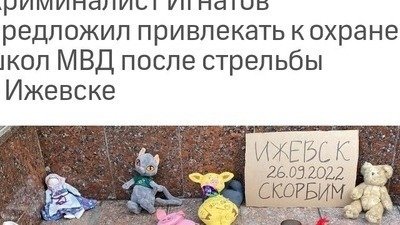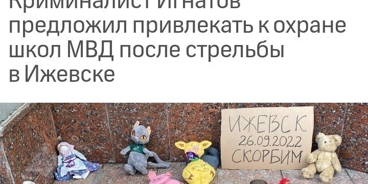 Сегодня 26 сентября 2022 в российской школе снова расстреляли детей. Детей, которых родители за руку привели учиться в школу, безопасность в которой должно обеспечивать государство! Сколько ещё малышей должны погибнуть чтобы Правительство РФ реально занялось решением этого вопроса, а не отделывалось очередными формальными проверками?! Почему в школах нет нормальной действенной охраны? Раз мы живём в такое сложное и тревожное время, то приводя ребёнка в школу родители должны быть уверены что он в безопасности, а не трястись от мысли о том, доживёт ли ребёнок до вечера!!!
