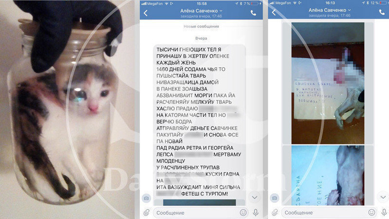 Данные лица путем сговора с помощью неизвестных (фейковых) страниц, которые они умышленно скрывают и регистрируют на сим-карты без владельца, занимаются тем, что отрезают животным (котятам) головы, варят животных в кипятке, убивают с особой жестокостью и весь процесс преступники снимают на камеру мобильного телефона, расчленяют животных на камеру и подкладывают к фрагментам тел кошек записки с фамилией людей.
