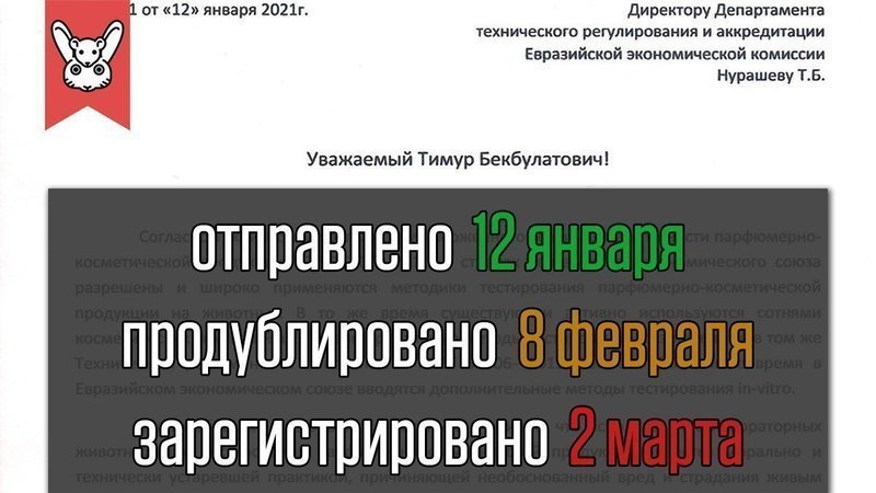 12 января мы писали, что отправили письмо директору Департамента технического регулирования и аккредитации Евразийской экономической комиссии Нурашеву Тимуру Бекбулатовичу на официальную электронную почту, указанную на сайте ЕЭК, с просьбой о проведении встречи по обсуждению вопроса о запрете тестирования косметики на животных.