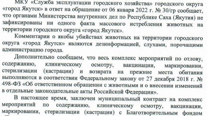 На днях, получила ответ из мэрии г. Якутска, на моë письмо с требованием отстановить бойню собак в городе. Не смогла не поделиться с вами!