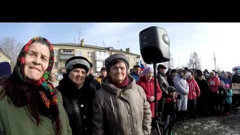 Хорошо организован новосинеглазовцами: звук хороший, флаги, плакаты. Жаль только, администрация районная не уважила людей и не почистила площадку от снега- в итоге, люди стояли почти в воде.