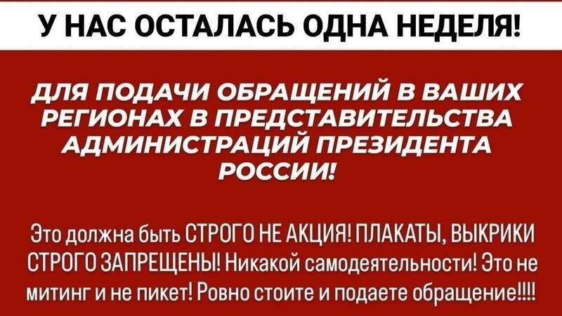 📣Объявляется ВСЕРОССИЙСКАЯ ПОДАЧА ОБРАЩЕНИЙ В РЕГИОНАЛЬНЫЕ ПРЕДСТАВИТЕЛЬСТВА АДМИНИСТРАЦИИ ПРЕЗИДЕНТА!