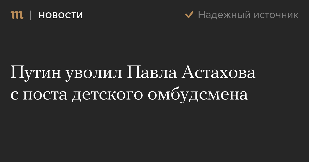 Media mentionОтправить в отставку детского омбудсмена Павла АстаховаПутин уволил Павла Астахова с поста детского омбудсмена - Meduza