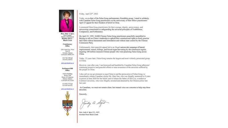«25 апреля 1999 года 10 000 китайских практикующих Фалуньгун мирно собрались в Пекине, чтобы призвать руководство Китая поддержать их конституционные права свободно исповедовать свою веру, не подвергаясь преследованию, запугиванию и государственному контролю Коммунистической партии Китая. Как сопредседатель группы “Парламентские друзья Фалуньгун”, я выражаю солидарность с канадскими последователями Фалуньгун в годовщину обращения их товарищей 25 апреля в защиту свободы вероисповедания в Китае», – заявила 22 апреля член парламента Джуди Сгро в своём письме, направленном Ассоциации Фалунь Дафа Канады.