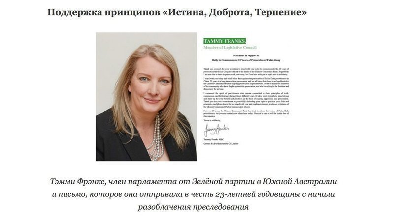 Тэмми Фрэнкс, член парламента от Зелёной партии в Южной Австралии, написала: «Двадцать три года – это большой срок для преследования, и мы все знаем, что у Коммунистической партии Китая нет законных оснований для продолжения преследования практикующих. Я хочу поблагодарить членов сообщества, которые борются против этих жесткости, и которые так долго отстаивают свою свободу и демократию. Я высоко ценю дух практикующих, которые остаются верными своим принципам “Истина, Доброта, Терпение” в эти трудные годы.
