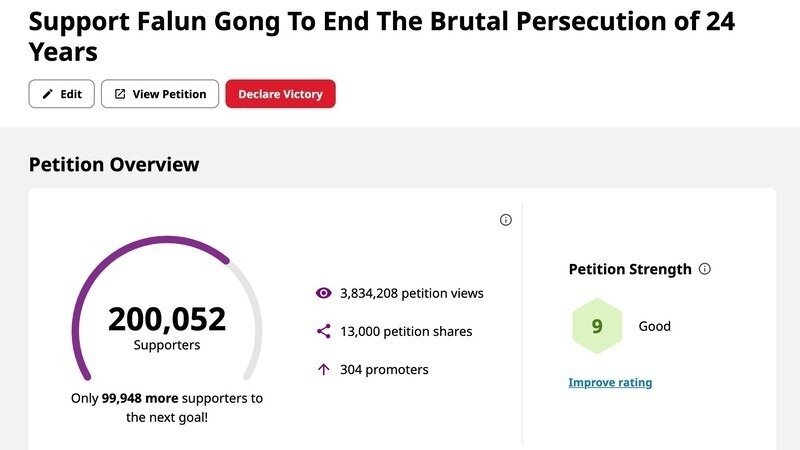 Petition updateПоддержите Фалуньгун, дабы положить конец преследованиям, которые продолжаются 26 летБолее 200 000 подписей! Спасибо и, пожалуйста, помогите нам распространять правду дальше