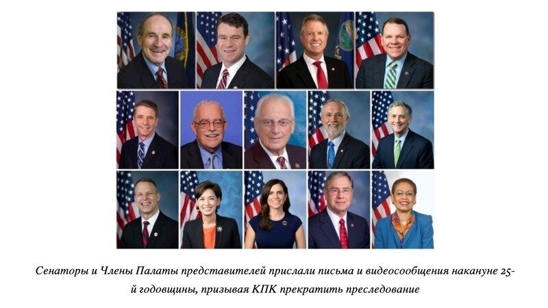 На протяжении более 25 лет последователи Фалуньгун подвергались невообразимым страданиям. Сегодня мы стоим вместе с вами. Мы поддерживаем ваши сообщества. Мы призываем к прекращению репрессий, пыток, тюремного заключения и началу новой эры свободы для Фалуньгун и для всех религиозных групп в Китае».