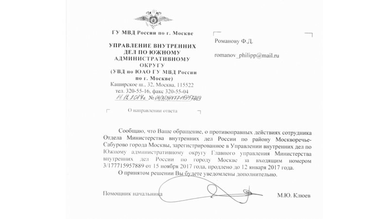 В преддверии праздника Дня святого Николая Чудотворца информирую всех - неравнодушных (уже подписавших мою петицию или только планирующих её подписать) к моей острой бедственной ситуации (с отсутствием возможности безопасно: для моих здоровья и жизни - использовать по назначению моё единственное жильё и с отсутствием возможности распоряжаться им - беспрепятственно продать его) - людей о свежей новости: сегодня (в 12:32 по МСК) на мой e-mail мне пришло письменное сообщение из УВД по ЮАО ГУ МВД России по г. Москве, подписанное помощником начальника: М.Ю. Клюев (прилагаю - в качестве доказательства моих слов - данный официальный ответ, т.к. в нём не содержится ФИО сотрудника правоохранительных органов, в отношении которого проводится расследование, поэтому данный официальный ответ не может являться секретным для общественности), суть которого в том, что моё обращение (хотя я писал подробные заявления, с видеодоказательствами) о противоправных действий сотрудника полиции ОМВД по району Москворечье-Сабурово г. Москвы продлено на срок до 12 января 2017 года.