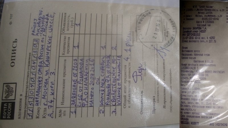 Стараюсь верить и продолжаю надеяться на то, что справедливость восторжествует и всё будет по законам Российской Федерации, но факты говорят об обратном, например (кроме вышеуказанного, считаю, бездействия должностных лиц), в ОМВД России по району Москворечье-Сабурово до сих пор ... НЕ ПОЛУЧЕНО моё заявление Начальнику данного ОМВД - с просьбой привлечь по УК РФ - виновных в моём избиении (когда удар, считаю, целенаправленно пришёлся мне, страдающему пороком сердца, в область сердца, и когда я - 10 лет бывший ранее на инвалидности именно по ортопедии, считаю, специально - навзничь - был толкнут - позвоночником и больными суставами - на полку для обуви - с острыми углами, после чего месяц был вынужден: проходить лечение у кардиолога и хирурга, носить - в летнюю жару - спец. мед. воротник на шее, физически и морально страдая, но данное преступление против моих: здоровья и жизни остались безнаказанными - подробнее читайте далее) 20.07.2016 в данной коммунальной квартире, отправленное ещё ... 21.07.2016 "Почтой России" ценным письмом (с письменными свидетельскими показаниями Романовой Л.В. - внутри данного письма) с почтовым идентификатором 11530401041303 (с заказным уведомлением), которое ... до сих пор находится в одном из почтовых отделений "Почты России" https://www.pochta.ru/tracking#11530401041303 , не исключено, из-за взаимосвязи с фактом того, что брат жильца комнаты №1, возможно, действительно является ... майором полиции ЮАО (о чём устно сообщил жилец комнаты №1 - в данной коммунальной квартире - 16.12.2016 - ссылки на видеодоказательства данной беседы были отправлены нами ранее в правоохранительные и надзорные органы). Уточню, что Романова Л.В. устно проинформировала (я - болеющий после избиения - уже спал, т.к. время прихода его было позднее - ближе к 22 часам) участкового уполномоченного полиции (во время его явки в вышеуказанную коммунальную квартиру - по сигналу ему из ГКБ №68 - о факте доставки меня туда 20.07.2016 на автомобиле "Скорой помощи" - его бригадой - после избиения http://deita.ru/news/5158957-devushka-izbila-primorskogo-uchenogo-v-kommunalke/ меня в вышеуказанной квартире - при соучастии нескольких жильцов комнаты №1) о том, что "Почтой России" 21.07.2016 было отправлено моё вышеуказанное заявление - ценным письмом (с письменными свидетельскими показаниями Романовой Л.В. в нём) Начальнику ОМВД России по району Москворечье-Сабурово, и данному участковому были предъявлены - для его визуального ознакомления - подтверждающие почтовые документы (квитанция, опись вложения - см. их на фото - в заголовке к данному обновлению к моей петиции), и именно после сообщения участковому вышеуказанной информации ... данное письмо (с вышеуказанным моим заявлением) в данном ОМВД ... не получили. В следующем же календарном месяце - после вышеуказанного избиения меня - собственница - пенсионерка комнаты №1 и её данный сожитель (у которого, с его слов, брат ... майор полиции ЮАО, а сам данный пенсионер, с его слов, имеющий просторную квартиру в районе Ясенево г. Москвы) ... зарегистрировали брак (не исключено, по этой же схеме, ровно год спустя, зарегистрировала брак новая жительница комнаты №1 с незаконно проживающим много месяцев подряд там ... сотрудником полиции), показывая себя СЕМЬЁЙ, а не организованной группой граждан, живущих некоторое время на одной территории и совершающих преступления в отношении иных жильцов - нас - в данной коммунальной кв