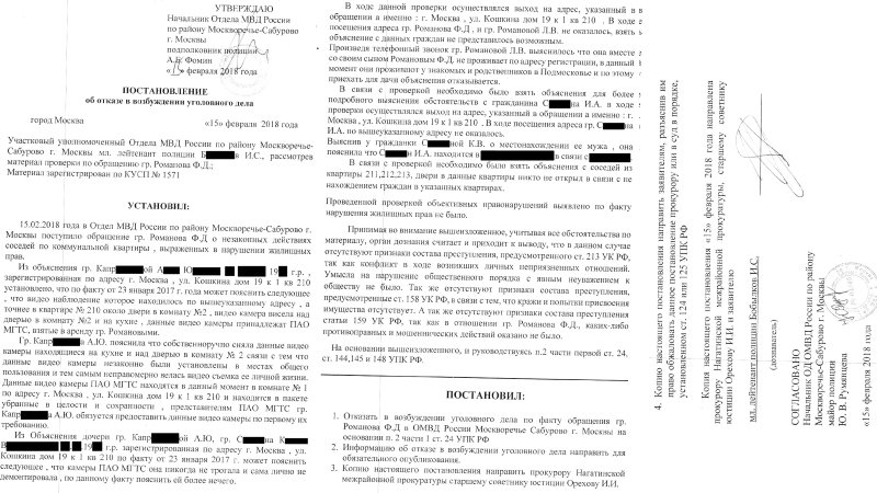 23 марта 2018 года на мой e-mail romanov_philipp@mail.ru мне поступило сообщение (разместил его по ссылке https://ic.pics.livejournal.com/filipp_romanov/65293445/621715/621715_original.jpg ) за подписью начальника Отдела МВД России по району Москворечье-Сабурово г. Москвы А.Е. Фомина, сообщающее мне о том, что: "...в Отделе МВД России по району Москворечье-Сабурово г. Москвы по факту Вашего обращения, зарегистрированного по КУСП № 1571 от 15.02.2018 года проведена проверка. 15.02.2018 года принято решение об отказе в возбуждении уголовного дела в соответствии с п. 2. ч.1 ст.24 Уголовно-процессуального Кодекса РФ. Копия постановления об отказе в возбуждении уголовного дела прилагается." К вышеуказанному сообщению, поступившему 23.03.2018 на мой e-mail, был приложен скан копии указанного постановления - от 15.02.2018 - спустя более, чем через месяц от даты подписания данного постановления, присланный нам только после нашей: коллективной: моей и Романовой Л.В. - письменной жалобы от 22.02.2018 Начальнику УВД по ЮАО ГУ МВД России по г. Москве Плугину Р. Ю. (на ответ Романову Ф.Д. от 15.02.2018 №04/43-276 - разместил его по ссылке https://ic.pics.livejournal.com/filipp_romanov/65293445/621914/621914_original.jpg - за подписью Начальника ОМВД Росии по району Москворечье-Сабурово г. Москвы - Фомина А.Е.), в т.ч. - в п. II, и на то, что 20.02.2018 мне - на мой e-mail - поступили, - разместил их по ссылке: https://ic.pics.livejournal.com/filipp_romanov/65293445/622314/622314_original.jpg , - в одну указанную дату - четыре сообщения: одно, подписанное 24.01.2018 и три, подписанных 06.02.2018 - об отказах в возбуждении уголовных дел по моим заявлениям, но без приложения к ним копий постановлений об отказах в возбуждении уголовных дел, в связи с чем я был лишён возможности обжаловать данные постановления, не имея текстов данных постановлений - об отказах в возбуждении уголовных дел, т.е., лишённый законного права ознакомиться с информацией из текстов вышеуказанных данных постановлений). В качестве доказательства вышеизложенного - прилагаю текст вышеуказанной нашей (моей и Романовой Л.В.) - жалобы от 22.02.2018 и ответ - от 22.03.2018 (разместил его по ссылке: https://ic.pics.livejournal.com/filipp_romanov/65293445/622437/622437_original.jpg ) мне (ответы Романовой Л.В. должностными лицами игнорируются, хотя почти все заявления: в правоохранительные органы, надзорные органы и иные гос. учреждения г. Москвы составлены и отправлены именно от нас обоих: меня и Романовой Л.В., т.к. в коммунальной квартире, расположенной по адресу: г. Москва, ул. Кошкина, д. 19, к. 1, кв. 210, были нарушены права и свободы каждого из нас) на неё, подписанный Начальником ОМВД России по району Москворечье-Сабурово г. Москвы - А.Е. Фоминым (должностным лицом, в отношении которого, в т.ч. - возможных: бездействия, халатности и/или сговора - и была нами составлена и отправлена 22.02.2018 вышеуказанная жалоба Начальнику УВД по ЮАО ГУ МВД России по г. Москве Плугину Р. Ю., зарегистрированная - в электронном виде - на сайте мвд.рф - в УВД по ЮАО ГУ МВД России по г. Москве под № 3/187702927474 ); и вышеуказанный ответ, считаю, является необоснованным, т.к., во-первых, я не жаловался на действия сотрудников отдельного взвода патрульно-постовой службы полиции Отдела Министерства внутренних дел Российской Федерации по району Москворечье-Сабурово города Москвы (как написано в данном сообщении мне - от 22.03.2018 - за подписью вышеуказанного А.Е. Фомина) и я не предъявлял требования имущественного характера, которые в компетенцию органов внутренних дел не входят ( как написано в 
