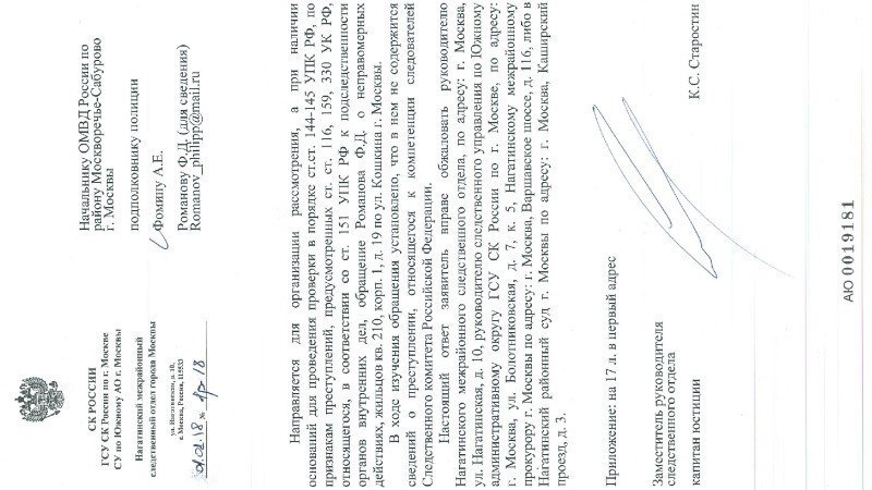 01.02.2018 мне - на мой e-mail - поступило (адресованное мне - для сведения) сообщение - со сканом документа (разместил его - по ссылке: https://ic.pics.livejournal.com/filipp_romanov/65293445/659113/659113_original.jpg ) - от 01.02.2018 №1р-18, за подписью Заместителя руководителя следственного отдела - капитана юстиции - К.С. Старостина - из Нагатинского межрайонного следственного отдела г. Москвы, - на имя Начальника ОМВД России по р-ну Москворечье-Сабурово г. Москвы - подполковника полиции - Фомина А.Е., - направленное "...для организации рассмотрения, а при наличии оснований для проведения проверки в порядке ст.ст. 144-145 УПК РФ, по признакам преступлений, предусмотренных ст. ст. 116, 159, 330 УК РФ, относящегося, в соответствии со ст. 151 УПК РФ к подследственности органов внутренних дел, обращение Романова Ф.Д. о неправомерных действиях, жильцов кв. 210, корп. 1, д. 19 по ул. Кошкина г. Москвы". Судя по перечисленным статьям УК РФ, - в Нагатинском межрайонном следственном отделе г. Москвы - увидели - на подтверждающих видео - в тексте моего - соответствующего - заявления - нарушения моих (и Романовой Л.В.) прав и свобод - минимум по трём статьям УК РФ: "Побои", "Мошенничество" и "Самоуправство", но должностные лица правоохранительных органов ОМВД России по р-ну Москворечье-Сабурово (куда - по подследственности - было перенаправлено моё заявление) - не увидели - на подтверждающих видео - нарушений моих (и Романовой Л.В.) прав и свобод - в вышеуказанной коммун. кв-ре - даже по вышеуказанным трём статьям УК РФ, хотя кроме обозначенных нарушений моих (и Романовой Л.В.) прав и свобод, - повторюсь, - имеются подтверждающие видео целого ряда иных нарушений наших прав и свобод: кража и порча имущества; нанесение вреда здоровью (в т.ч., - не исключено, - покушение на убийство, - учитывая наличие у меня порока сердца и бронхиальной астмы, - при информированности о чём - жильцы комнаты №1 намеренно травили меня хлоркой, уксусом и бытовой химией); препятствия нам в пользовании и распоряжении своим имуществом; угрозы нашим: здоровью и жизни каждого; нецензурные оскорбления нас; унижение чести и достоинства каждого из нас; незаконное вселение незарегистрированного гражданина (который не являлся родственником жильцам комнаты №1 и не являлся собственником в данной кв-ре коммунального заселения) - на длительный срок - в данную коммун. кв-ру; и т.д., и т.п. (подробнее - в примере - убрав информацию о личных данных третьих лиц и убрав ссылки на видеодоказательства - наших заявлений в надзорные органы г. Москвы и Президенту РФ: https://drive.google.com/file/d/1o2QgopRqmvJo_4lrHHGZSqmg0mnPmcGO ). Повторюсь, что на наши - неоднократные - письменные заявления - с 2016 г. - в правоохранительные органы г. Москвы, - из ОМВД России по р-ну Москворечье-Сабурово мне - на e-mail - поступают однотипные ответы (в т.ч. - постановление - об отказе в возбуждении уголовного дела - от 15.02.2018 - размещено по ссылке https://ic.pics.livejournal.com/filipp_romanov/65293445/621715/621715_original.jpg - с указанием в данном постановлении иной, - не соответствующей реальной, - фамилии собственницы комнаты №1 по вышеуказанному адресу, - о чём подробно я написал в своём - соответствующем - обновлении к моей - данной петиции), например, как: