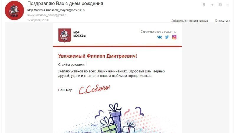 К сегодняшней календарной дате, - к огромной моей беде, исполнилось уже более двух лет и трёх месяцев со дня начала моих (и моей мамы, и нашей 13-тилетней кошки) вынужденных скитаний https://www.youtube.com/watch?v=rCrgm_qq2Jc - при бездействии ряда должностных лиц г. Москвы - на наши регулярные и подробные заявления им - с просьбой помочь нам в нашей тяжелейшей жизненной ситуации, когда 23.01.2017 мы лишились возможности безопасного и беспрепятственного проживания в своём единственном жилье (в моей комнате №2 - в 2-комнатной коммунальной квартире, находящейся по адресу: г. Москва, ул. Кошкина, д. 19, корп. 1, кв. 210), как и лишились - позднее - возможности беспрепятственно продать мою комнату, - в результате чего мы лишены возможности купить себе иное жильё, где мы могли бы безопасно и беспрепятственно жить, где я мог бы: продолжить заниматься наблюдательной астрономией и подготовиться к вступительным испытаниям в университет - для обучения на астронома. Считаю личным оскорблением (если - не издевательством) для себя - в моей тяжелейшей жизненной ситуации (более 2 лет в вынужденных скитаниях по чужим углам - при бездействии ряда должностных лиц г. Москвы - на заявления им о противоправных действиях в отношении меня и мамы в вышеуказанной коммунальной квартире) - отправлять мне - на мой e-mail - поздравление (см. - соответствующее фото данного поздравления - за подписью С.С. Собянина - в начале данного обновления к моей петиции) к моему Дню Рождения от Мэра г. Москвы - с пожеланиями: успехов во всех моих начинаниях (учитывая, что я уже два года лишён возможности заниматься наблюдательной астрономией, т.к. всё моё астрономическое оборудование осталось в моей комнате в Москве, и вместо полноценных занятий наукой астрономией - мне приходится постоянно составлять и отправлять мои подробные заявления в различные гос. инстанции - с просьбой помочь мне в моей тяжелейшей жизненной ситуации), здоровья (учитывая, что кроме порока сердца у меня имеется целый ряд хронических заболеваний: бронхиальная астма, заболевания: крови и суставов, но я не только давно не имею возможности получать лекарства в поликлинике - по месту моей регистрации - в г. Москва, но и давно не имею возможности пройти плановое диспансерное обследование - от вышеуказанной поликлиники - у врачей, например: у кардиолога, гематолога, аллерголога-иммунолога, ортопеда и др.), ... счастья (учитывая, что не было ни одного счастливого дня в моей жизни с тех пор, как я лишился возможности безопасного и беспрепятственного проживания в своём единственном жилье: вынужденные ночёвки на вокзалах, изредка - благотворительные - приёмы пищи при православных Храмах, истрёпанные - в скитаниях - одежда и обувь, невозможность подготовиться к поступлению в университет - для обучения на астронома, нищета - из-за постоянных вынужденных материальных трат - на аренду чужого жилья и т.д., и т.п., голод - при хронических заболеваниях у меня: суставов, крови и др., - иногда у меня нет возможности купить даже хлеб - во время вынужденных скитаний, - а не то, - чтобы: молочную продукцию и/или рыбную продукцию, и/или мясную продукцию, и/или фрукты, - хотя при имеющихся у меня хронических заболеваниях, например, крови и суставов, мне нужно полноценно питаться - с употреблением продуктов с кальцием и др. полезными составляющими в них - счастья всё это, - естественно, - мне
