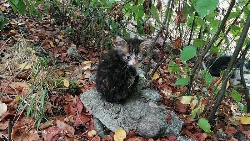 История первая: люди услышали едва различный писк котёнка и отправились на поиски источника звука. Глубоко в зарослях сидел маленький котёнок: шерсть в репейнике, глазик залеплен гноем, а сам еле живой.