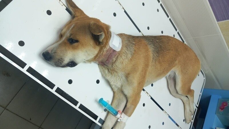 Хирургическая чистка ран, санация ротовой полости, стерилизация приютских животных. (на фото собачка с разрывом мягких тканей шеи от ношения тесного ошейника)