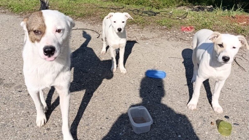 Они очень похожи. Все беленькие, чистенькие. Возможно это папа и дочки. Возможно это братец из предыдущего помета и новые щенки из последнего. Всю семью вывезли и мама где-то погибла.