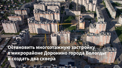 Микрорайон «Доронино» города Вологды самый ужасный по плотности застройки, настоящие каменные джунгли. На площади в 27 Гектар проживает 12 тысяч вологжан, которые не обеспечены в пределах микрорайона ни одной школой, детским садом и рекреационной зоной. При этом власти считают, что жителям микрорайона это не нужно и они продолжают согласовывать застройку каждого свободного квадратного метра земли. Сейчас началось очередное строительство многоэтажки и жители выступают резко против. Мы хотим объединить жителей микрорайона и запретить здесь дальнейшее строительство, а также создать две зоны отдыха.