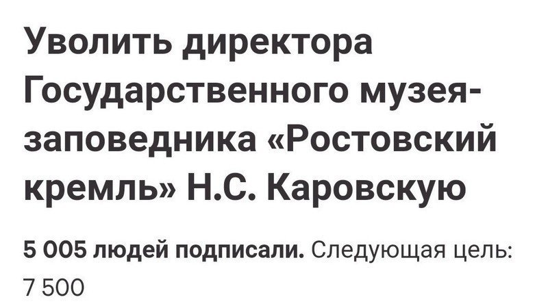 Дорогие друзья, вчера, в день государственного праздника народного единства и Казанской Богородичной иконы Петиция была подписана пятитысячным нашим единомышленником. Конечно, это не так много по сравнению с другими Петициями, собирающими десятки, сотни тысяч и даже миллионы подписей - ведь наша Петиция не про футбол и не про повышение пенсионного возраста. Но мы уверены, что сохранение и развитие Ростовского музея, чему препятствует непрофессиональная и безответственная деятельность нынешнего его директора Н.С. Каровской, задача большой важности.