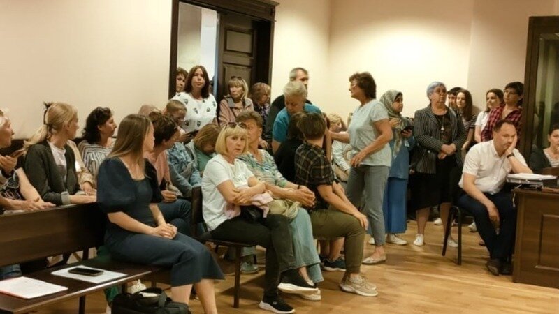 В зале заседаний нет свободного места! Женщина в платочке и с фиолетовыми волосами в полосатом пиджаке и мужичок в белой рубашке - это астраханские живодеры, которые хотят убивать собак!