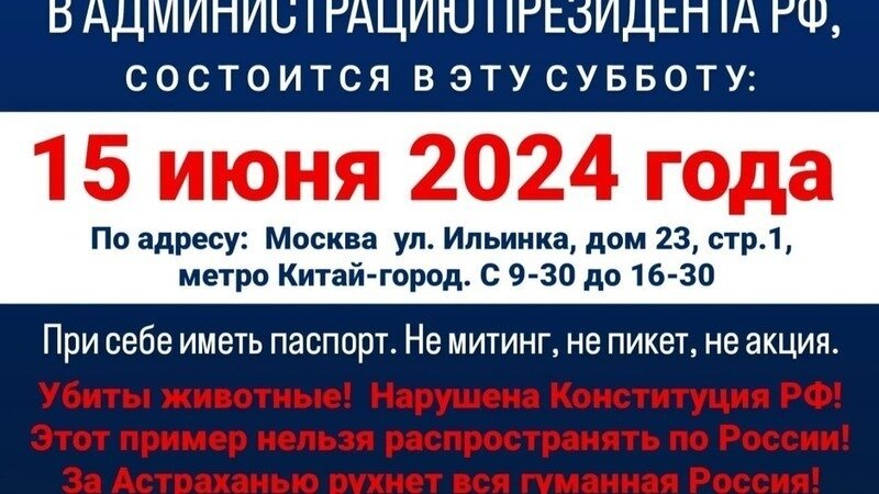 В связи с вступлением регионального Закона Астраханской области от 27.12.202З № 129/2023-ОЗ «О порядке осуществления деятельности по обращению с животными без владельцев на территории Астраханской области», противоречащего ФЗ от 27.12.2018 № 498-ФЗ «Об ответственном обращении с животными и о внесении изменений в отдельные законодательные акты РФ», а также вступлением в силу Постановления от 14.02.2024 №8 «О порядке создания, размещения и обустройства пунктов временного содержания животных, организации их деятельности и нормы содержания животных без владельцев на территории Астраханской области», Постановления от 04.06.2024 № 41 «О внесении изменений в постановление службы ветеринарии Астраханской области от 14.02.2024 №8», и действиями региональных властей и подрядных организаций (муниципальных и частных), предположительно направленными на создание искусственных преград к вывозу животных из пунктов временного содержания (далее ПВС) зооволонтерами, собственниками животных, неравнодушными гражданами, прошу провести проверку органами Центрального Аппарата РФ: