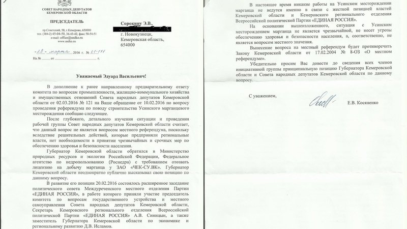 Обновление к петицииОстановите строительство завода первой степени экологической опасности электролитического марганца в Ширинском районе республики Хакасия в трёх километрах от посёлка Туим,который в разработке у компании ЗАО"Чек-Су.ВК.Письмо Председателя Совета народных депутатов Кемеровской области.