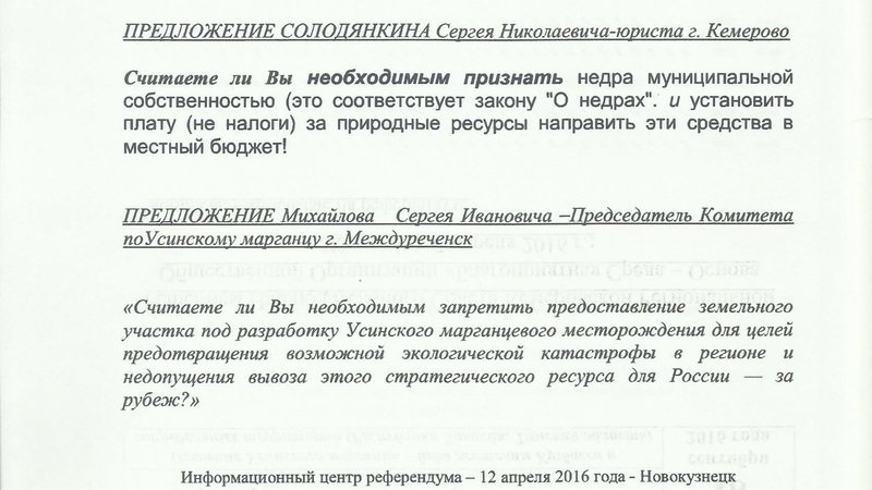 referendumВ день шуток, но по отнюдь не шуточным вопросам, в помещении фонда "Перспектива" г.Междуреченска, по инициативе его руководителя Полищука Г.Г., являющегося также председателем совета старейшин города, для целей обсуждения поднимаемых вопросов Комитетом по Усинскому марганцу, состоялось совещание. К обсуждению и принятию решений Михайловым С.И. были представлены два вопроса. Первый – о пребывании представителей общественности в составе Рабочей группы по вопросам разработки Усинского марганцевого месторождения, созданной постановлением Междуреченского городского округа № 217-п от 03.02.2016г. Второй – о формировании инициативной группы по подготовке референдума.