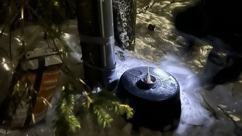 Потом этот корм развозится по СНТ, где стоят трубы для корма, вот с таким тазом, в котором вырезаются два окошка, для трубы и для того, чтобы коты могли зайти во внутрь. Такие тазы продаются в Леруа, трубы собираем сами из запчастей. Резать таз сложно. У нас стоит пока со старым контейнером, на следующую зиму тоже поставлю такой. Возьмите на заметку волонтеры - это отличная идея для кормления животных зимой.