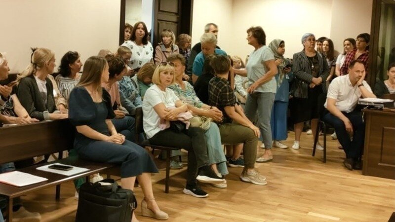 В зале заседаний нет свободного места! Женщина в платочке и с фиолетовыми волосами в полосатом пиджаке и мужичок в белой рубашке - это астраханские живодеры, которые хотят убивать собак!