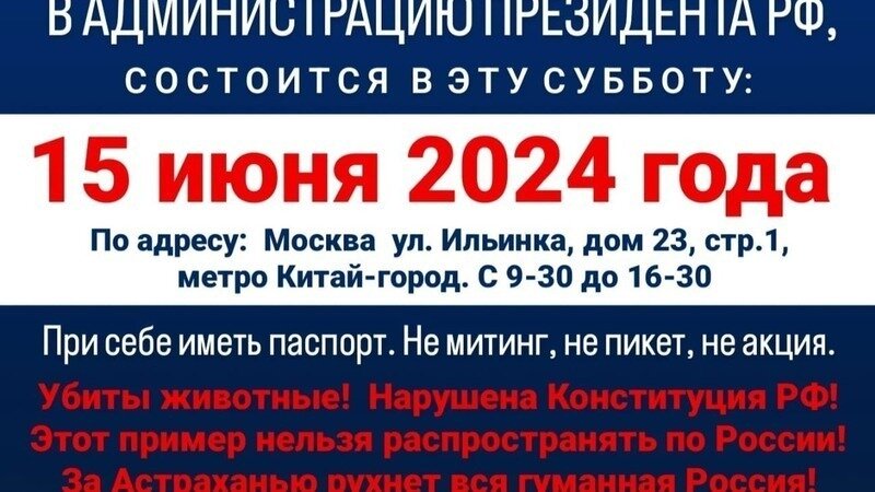 В связи с вступлением регионального Закона Астраханской области от 27.12.202З № 129/2023-ОЗ «О порядке осуществления деятельности по обращению с животными без владельцев на территории Астраханской области», противоречащего ФЗ от 27.12.2018 № 498-ФЗ «Об ответственном обращении с животными и о внесении изменений в отдельные законодательные акты РФ», а также вступлением в силу Постановления от 14.02.2024 №8 «О порядке создания, размещения и обустройства пунктов временного содержания животных, организации их деятельности и нормы содержания животных без владельцев на территории Астраханской области», Постановления от 04.06.2024 № 41 «О внесении изменений в постановление службы ветеринарии Астраханской области от 14.02.2024 №8», и действиями региональных властей и подрядных организаций (муниципальных и частных), предположительно направленными на создание искусственных преград к вывозу животных из пунктов временного содержания (далее ПВС) зооволонтерами, собственниками животных, неравнодушными гражданами, прошу провести проверку органами Центрального Аппарата РФ: