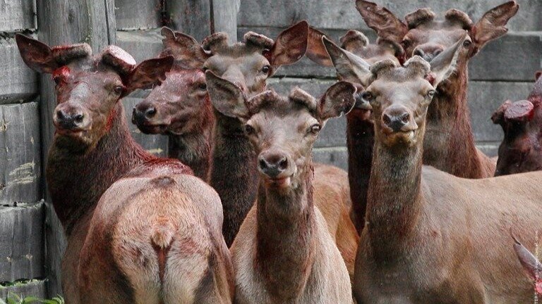 «Тем, у кого панты маленькие, протыкают ухо и вставляют бирку с номером – осенью во время гона их не допустят до самок. Потом шприц в шею и откачивание крови. Забирают не меньше литра, чтобы раздать загонщикам. Затем приближается резчик и режет ножовкой рога».