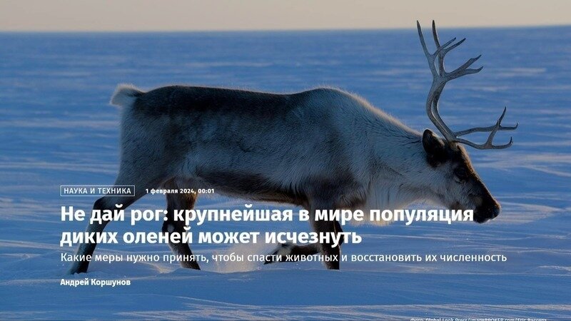 Специалисты НИИ сельского хозяйства и экологи Арктики — филиала Красноярского научного центра СО РАН опубликовали исследование, которое показывает, что таймырская популяция дикого северного оленя достигнет критического уровня в ближайшие один-два года, если не принимать меры https://iz.ru/1642730/andrei-korshunov/ne-dai-rog-krupneishaia-v-mire-populiatciia-dikikh-olenei-mozhet-ischeznut