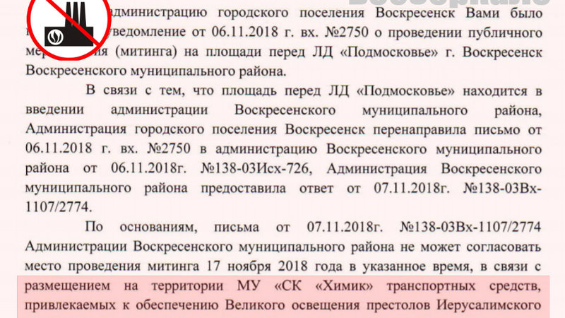 Администрация "... не может согласовать место проведения митинга 17 ноября 2018 года в указанное время, в связи с размещением на территории МУ "СК "Химик" транспортных средств, привлекаемых к обеспечению Великого освещения престолов Иерусалимского храма".