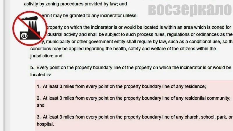 Я не случайно упомянул штат Делавэр. Открываем законодательство в том месте, где идет речь о выдаче разрешения на строительство мусоросжигательного завода и узнаем, что разрешение не может быть выдано, если от мусоросжигательного завода до жилья, школы, церкви, парка или больницы менее 3 миль, что составляет почти 5 километров. В России 800 метров от жилья до МСЗ, а в США – 5000? Да, именно так. Скажите, какое правительство больше любит своих граждан?