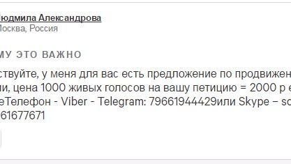 Вот такой комментарий: "Здравствуйте, у меня для вас есть предложение по продвижению вашей петиции, цена 1000 живых голосов на вашу петицию = 2000 р если интересно пишите Телефон - Viber - Telegram: 79661944429или Skype - softviber или в ICQ - 561577671".