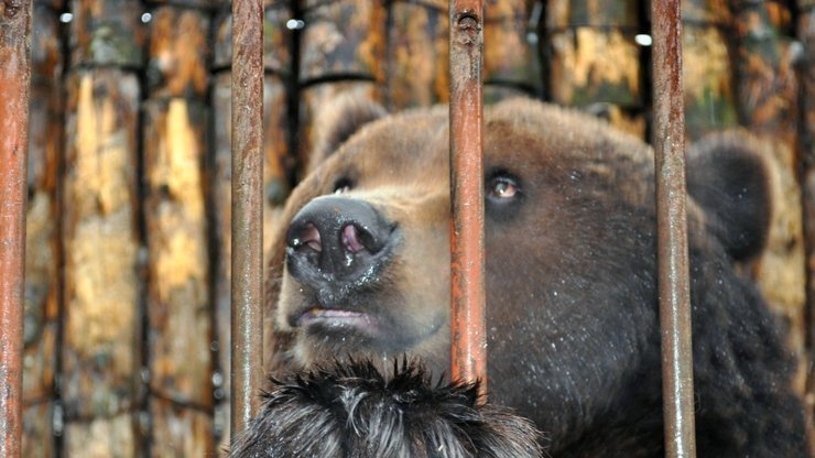 «На автомойке в 25 километрах от Москвы живет медведь. Зверь находится в маленькой клетке — три на три метра и с трудом может даже повернуться.