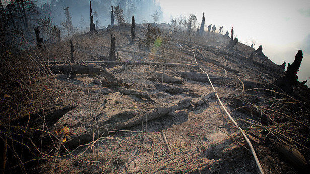 Сгоревший березовый колок, Новосибирская область. Березовые колки — небольшие участки леса среди обширных степных пространств или сельхозугодий — важнейший элемент природной среды лесостепной зоны юга Урала и Сибири; от них в очень большой степени зависит сохранение биологического разнообразия этой зоны, многих водных источников и водотоков, благоприятной окружающей среды для местного населения
