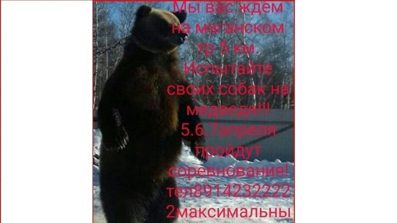 5-7 апреля (уже завтра!) в пригороде Якутии состоятся «состязания по натравливанию охотничьих собак на медведей». Полный текст объявления: «Мы вас ждём на Маганском тракте, 5 км. Испытайте своих собак на медведя. 5,6,7 апреля пройдут соревнования. Тел : 8914-232-22-22».