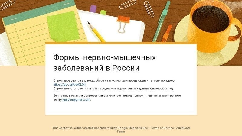 Если вы, или кто-то из ваших родных, близких страдают от нервно-мышечных заболеваний, пожалуйста, заполните форму по ссылке ниже. Это очень важно, как для нас, так и для вас!