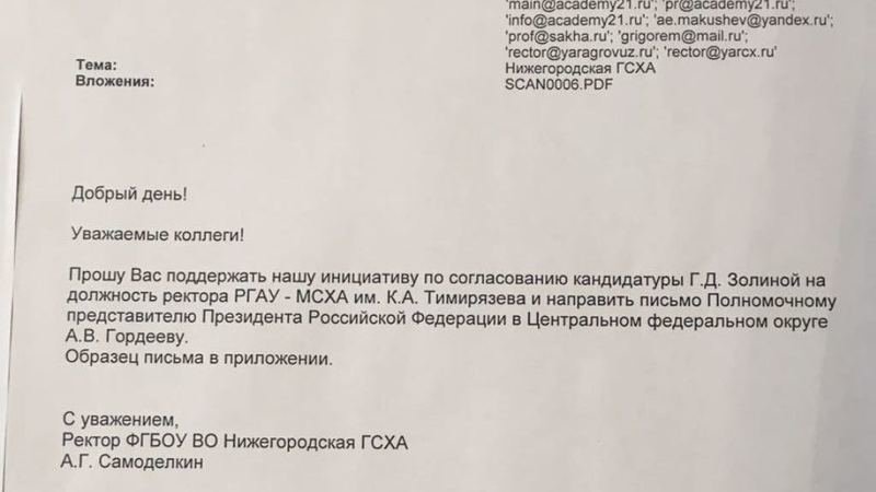 Ректор Самоделкин взял на себя инициативу выйти с обращением на все аграрные вузы в поддержку деятельности врио ректора Тимирязевки, а также ходатайствовать перед полпредом А.В. Гордеевым о согласовании кандидата филологических наук с двумя провальными защитами докторской диссертации на должность всемирноизвестного аграрного вуза.