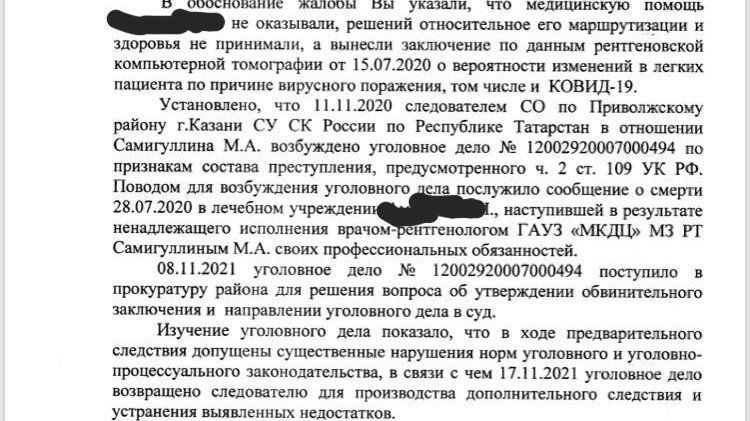 Обновление к петицииПрекратить уголовное дело в отношении врача-рентгенолога Самигуллина М.А. г.КазаньПрокуратура вернула дело в СК!