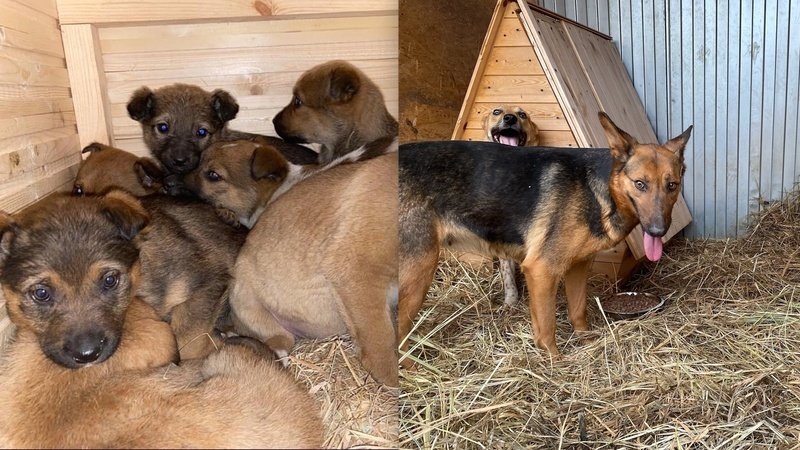 Время шло, и Найда в один день приручилась! Больше не убегала, живет в отдельном вольере теперь)! Малышей пристроили всех кроме двух Девочек (их вернули неродивые “хозяева”), они уже большие – имеют особенные отношения с Мамой, часто ночуют втроем в одном вольере даже)!