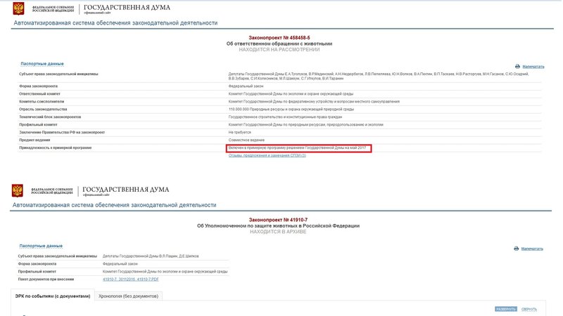Обновление к петицииПросим Вас ввести должность Уполномоченного по защите животных!Официальная информация о законопроектах