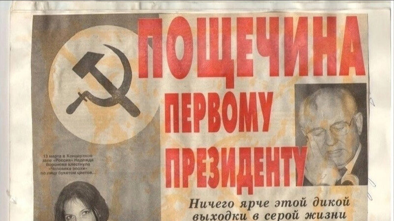 Зал ахнул и воцарилась тишина, а в воздух выбросили листовки, где был изображен Горбачев и стояла надпись «Супериуда, не смей показываться на глаза людям».