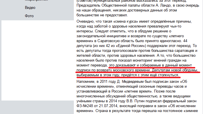 Однако и сейчас, по прошествии полугода, есть люди, которые снова хотят заставить нас поломать свои биоритмы из-за мифического "удобства" смотреть телевизор и "пораньше запускать салюты" на городских праздниках. В группе "Саратов-время московское" социальной сети Facebook появилась информация о том, что НАШИ ПРОТИВНИКИ — АДЕПТЫ почившего в Бозе МОСКОВСКОГО ВРЕМЕНИ — НАЧАЛИ СБОР РЕАЛЬНЫХ ПОДПИСЕЙ НА БУМАЖНЫХ НОСИТЕЛЯХ ПОД СВОЕЙ ИНИЦИАТИВОЙ. В сообщении оппонентов, опубликованном в аналогичной группе социальной сети "Одноклассники", НА ДАННЫЙ МОМЕНТ ИМИ СОБРАНО БОЛЕЕ 12 ТЫСЯЧ ПОДПИСЕЙ, которые будет представлены новому составу Саратовской областной думы, практически сразу после выборов 10 сентября.