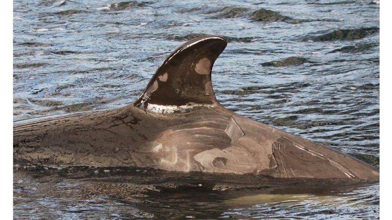 У некоторых белух заметны инфекционные заболевания, которые выражаются в виде черных пятен на коже.