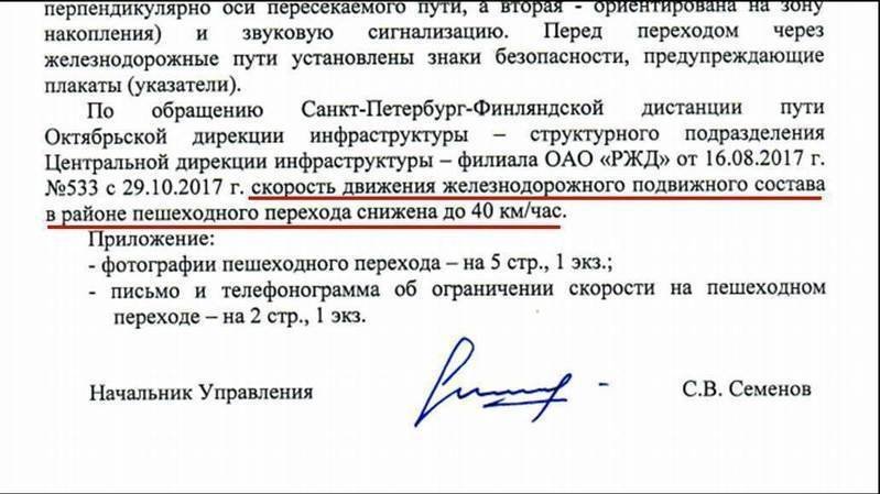 Федеральная служба по надзору в сфере транспорта ответила на нашу петицию. По информации службы, с 29.10.2017 скорость движения поездов в районе пешеходного перехода снижена до 40 км/час.