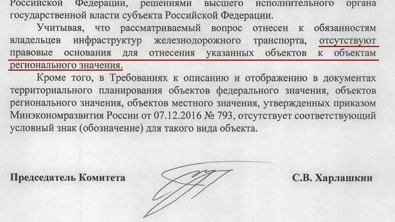 По мнению Комитета, "отсутствуют правовые основания для отнесения пешеходных переходов через ж/д пути к объектам регионального значения, подлежащим отображению на Генеральном плане Санкт-Петербурга", поскольку обеспечение безопасности на путях - это обязанность РЖД.