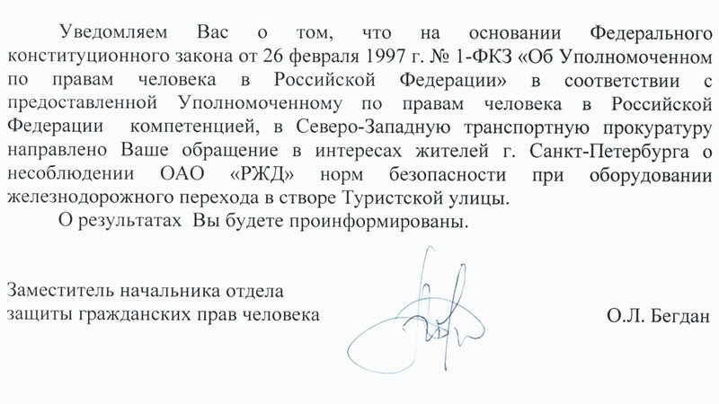 Mise à jour sur la pétitionСделайте ж/д переход на Туристской безопасным!Ответ на Петицию Уполномоченного по правам человека в России